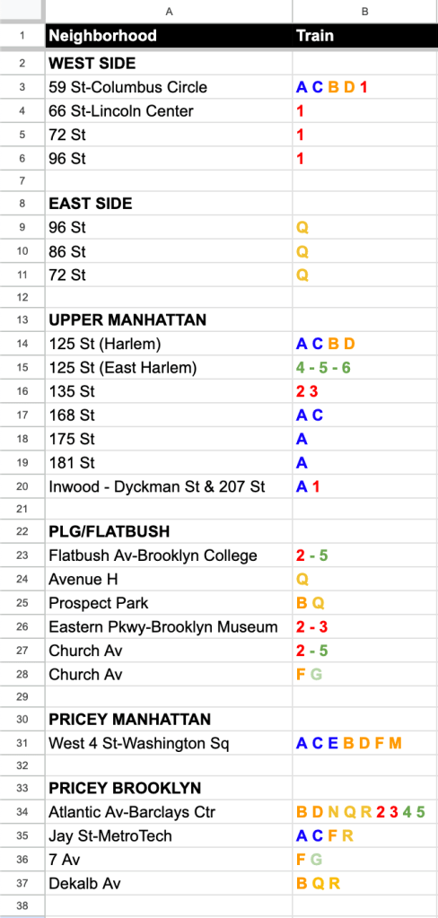 As I write this, Queens Plaza, Fordham Rd, Euclid Av, Dekalb Av, 66 St – Lincoln Center, and 161 St – Yankee Stadium are completely shut down accessibility-wise, but are still considered accessible stops. This is why having numerous train options, or being a taxi ride away from another accessible station, may help you avoid becoming housebound by the nature of trains.